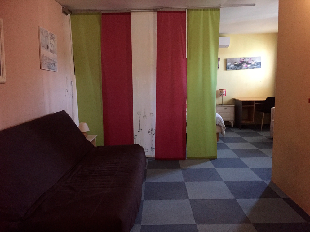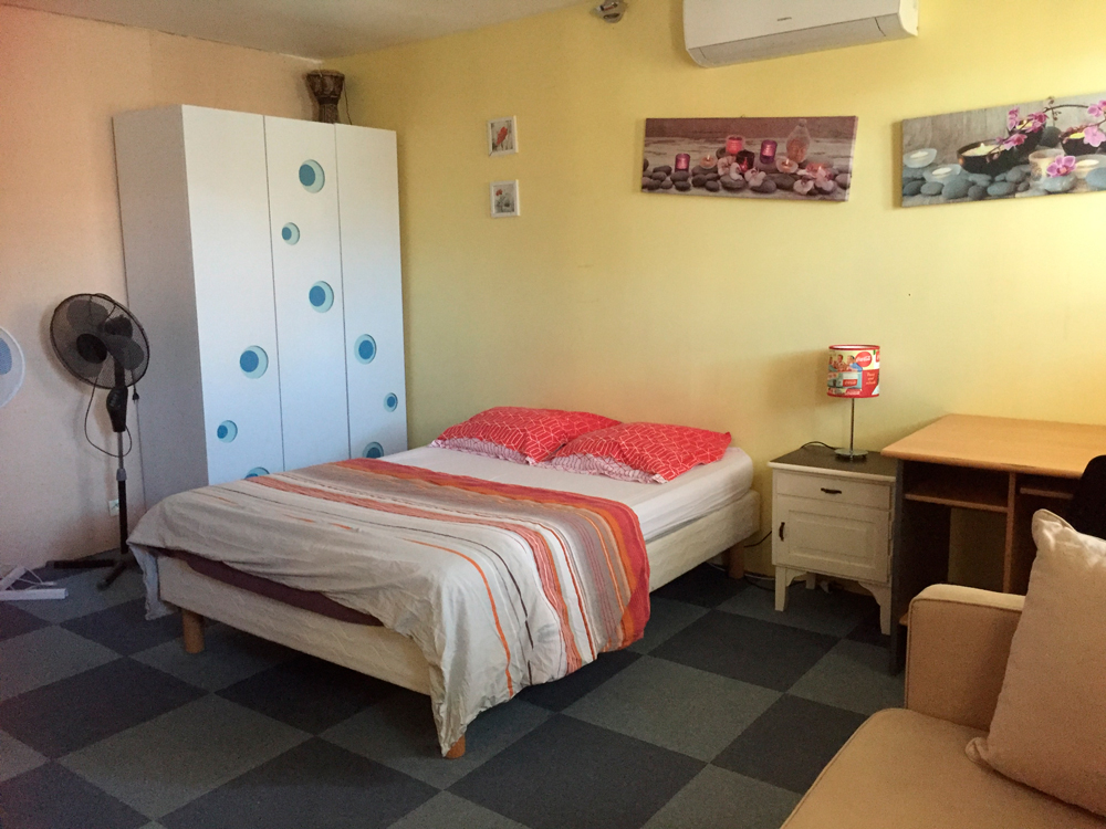 Une très grande chambre de 27 m² équipée d’1 lit en 140 sur 190 cm, un canapé-lit, 1 armoire, 1 commode, la climatisation ainsi qu’un ventilateur.