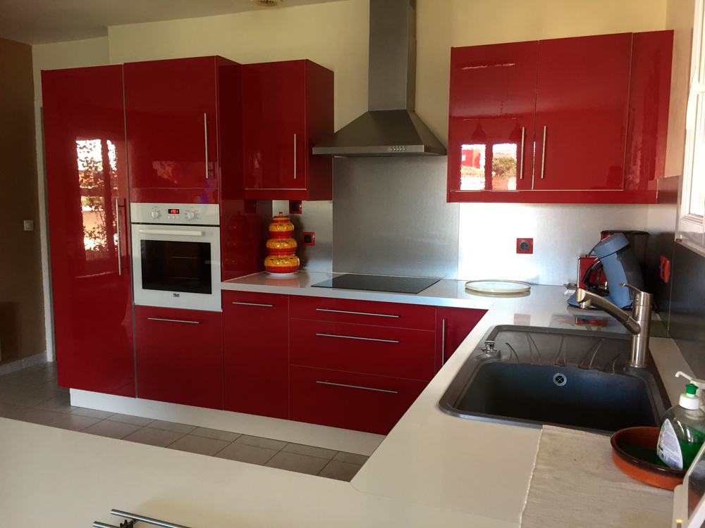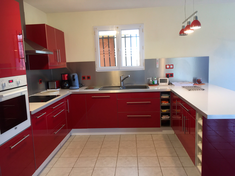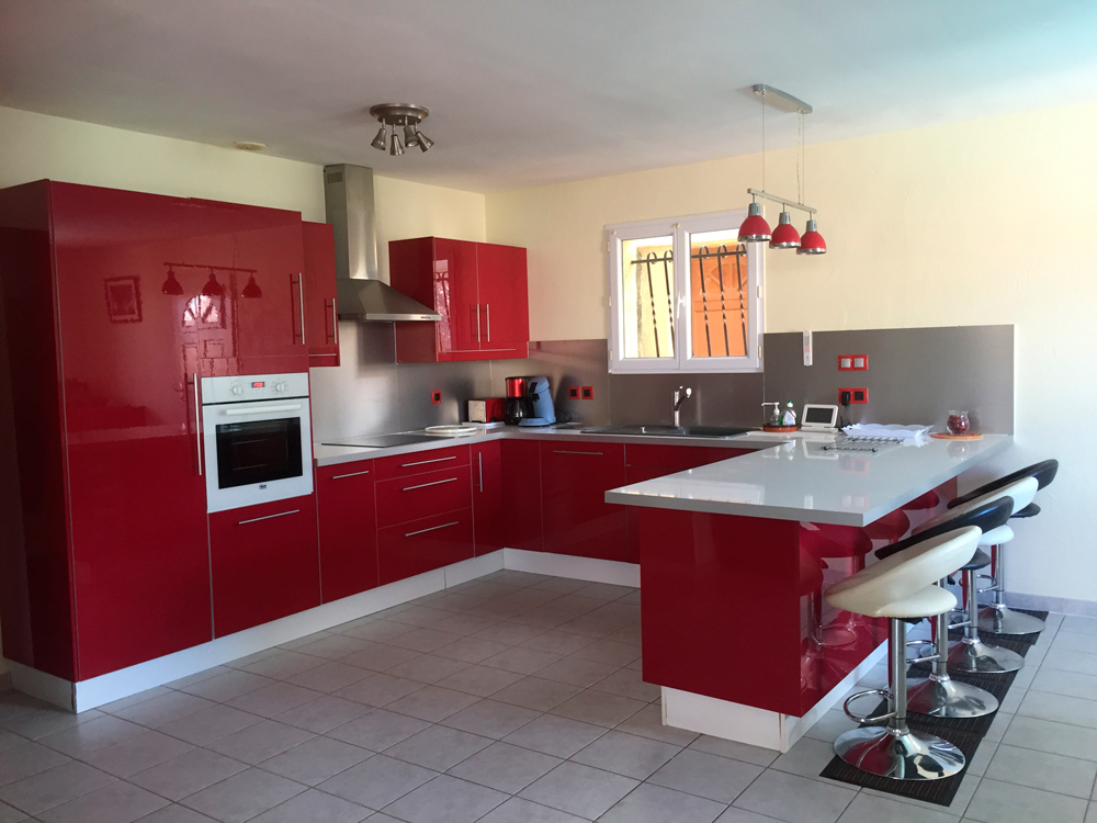 Plaque induction 4 zones, un four, un micro-ondes, une hotte aspirante, un frigidaire, un lave-vaisselle, un évier grande cuve, cafetières SENSEO, un grille-pain, un mixeur.