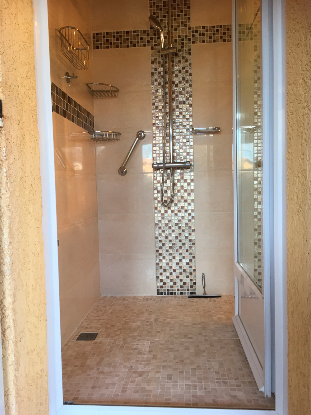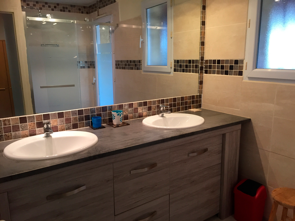 Double vasques, grand meuble & grand miroir, grande douche à l’italienne avec porte donnant sur l’extérieur, sèche cheveux, prises.