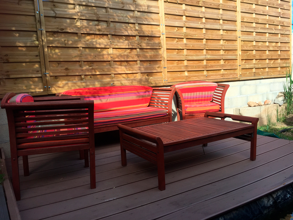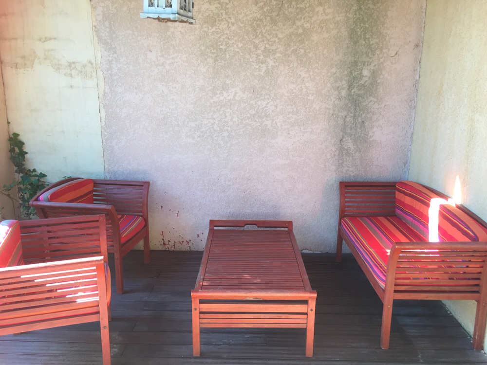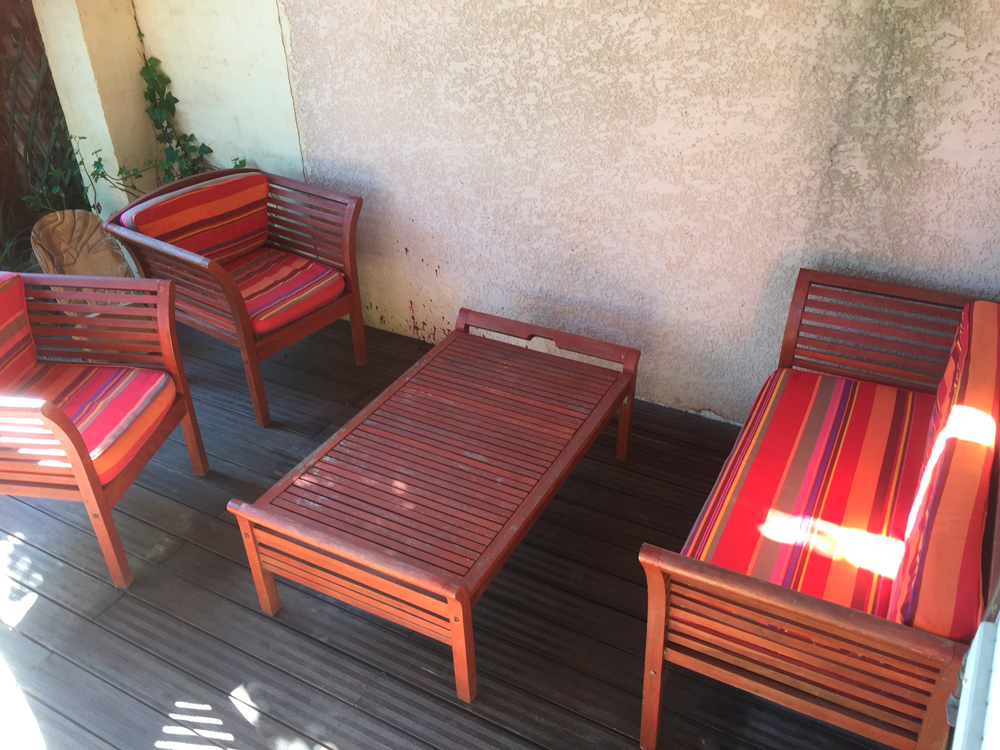 1ère terrasse : grande table en teck pour 10 personnes avec chaises.