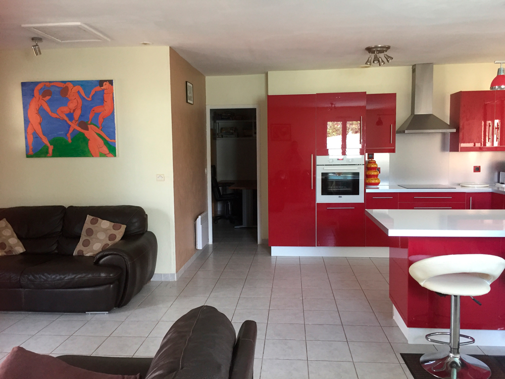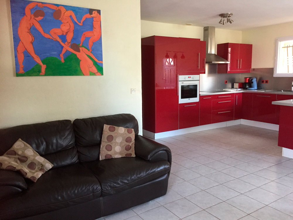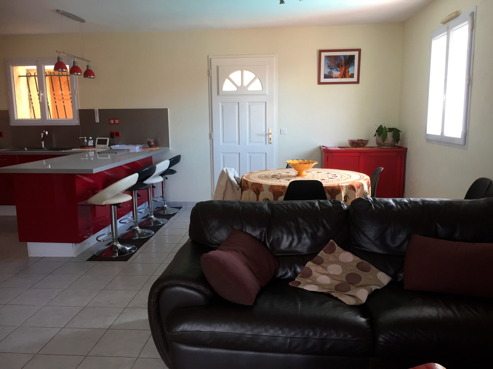 Une grand pièce avec cuisine américaine équipée & moderne.